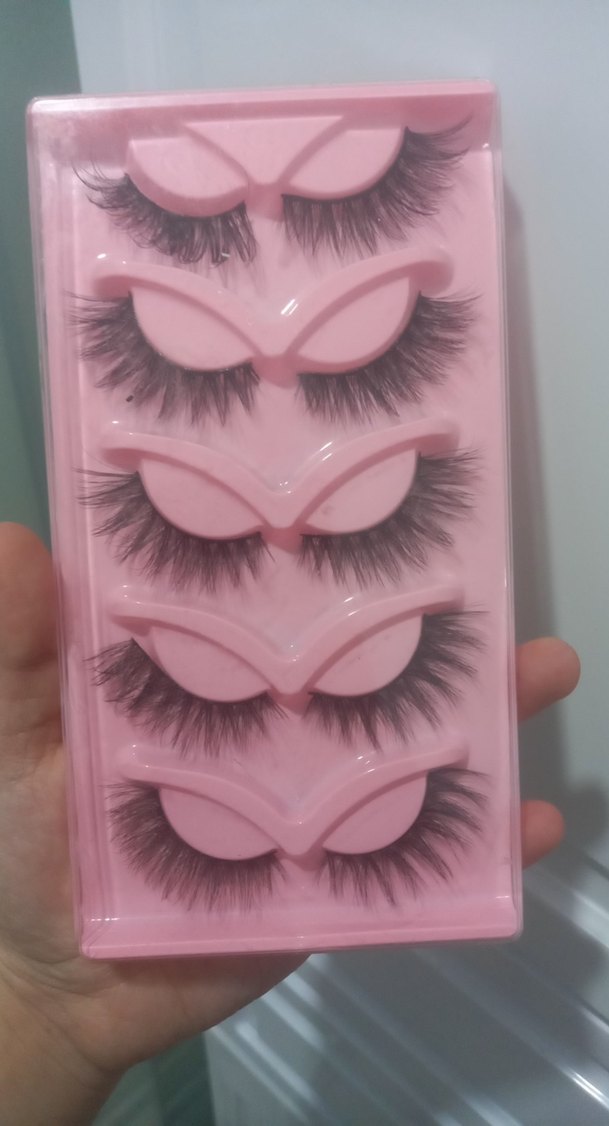 Beş çift açık pembe renkte, doğal ve hacimli görünüme sahip sahte kirpik seti. Göz makyajınızı güçlendirir.