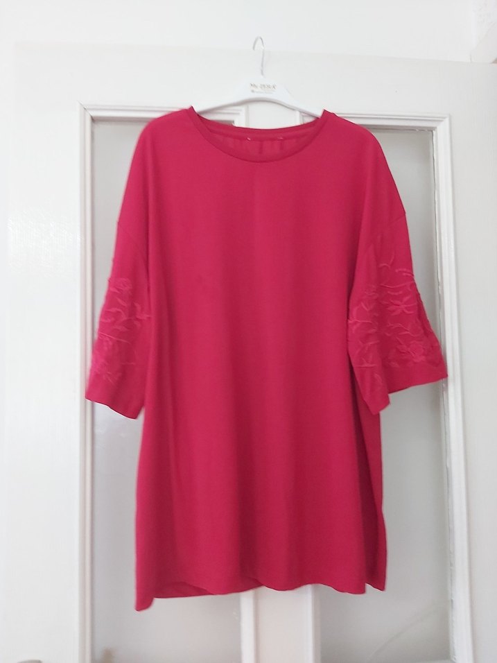 Pembe renk, salaş kesim tunik. Yuvarlak yaka, kısa kollu ve drapeli tasarıma sahiptir. Yumuşak ve ipeksi dokuludur, günlük kullanım için uygundur.