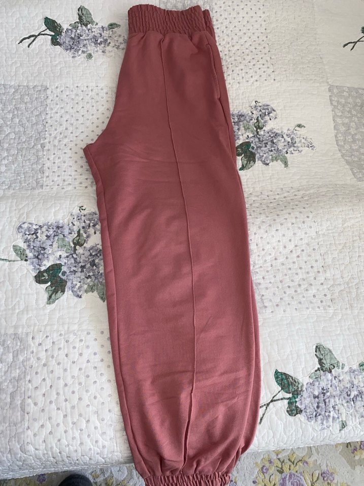 Pembe renkte, salaş kesim ve drapeli tasarıma sahip kadın eşofman altı. Yumuşak sentetik kumaştan üretilmiş, günlük kullanım için idealdir.