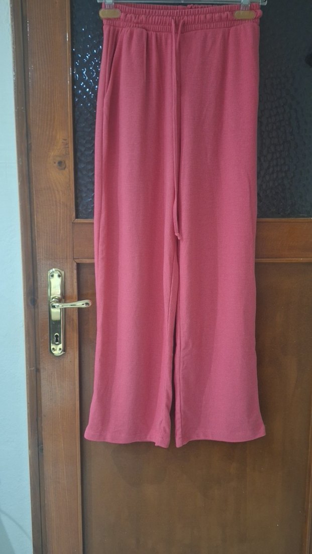 Pembe renkte, uzun ve salaş kesimli, dökümlü tasarıma sahip kadın eşofman alti Rahat ve günlük kullanıma uygun tarzda.