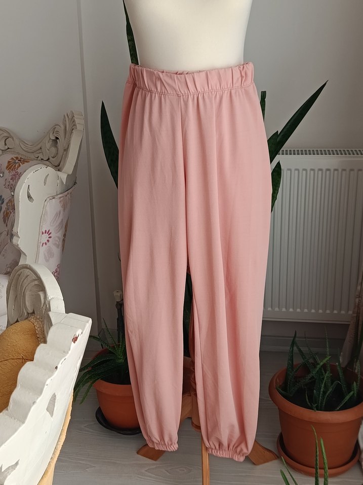 Pembe pastel renkli, salaş kesim, paçaları lastikli ve uzun boy kadın pantolon. Düz ve ipeksi dokulu, günlük kullanıma uygun rahat bir şıklık sunar.