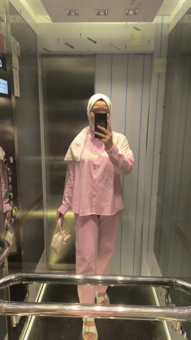 Pastel pembe, salaş kesim kadın takımı, uzun kollu ve yüksek yakalıdır. İpek gibi kumaştan üretilmiş, günlük kullanım için rahat ve sade bir şıklık sunar. Midi boy ve minimal tarzda, mütevazı bir görünüm sağlar.