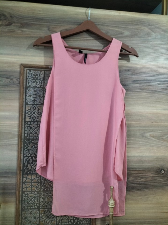 Pembe renkte, salaş kesim, askısız midi boyda bluz. Yumuşak sentetik kumaştan, drapeli detaylı, gündelik kullanıma uygun.