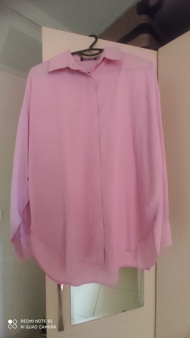 Pembe renkte, salaş kesim, midi boy ve uzun kollu gömlek. İpeksi kumaştan, yaka kısmı klasik ve drapeli tasarıma sahip.