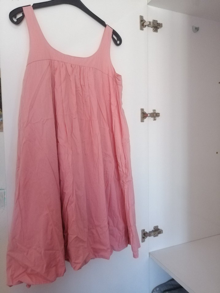 Keten kumaştan, pembe renkte, askılı, salaş kesim ve drapeli midi elbisedir. Minimalist ve bohem tarzı yansıtır.
