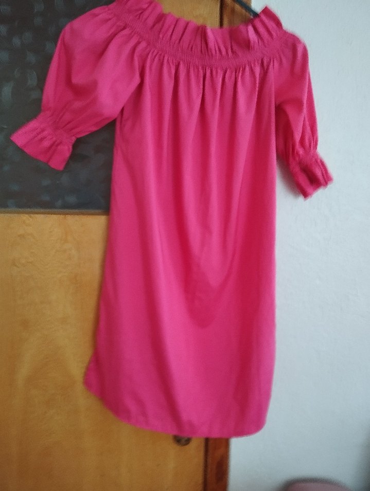 Pembe renkte, salaş kesim, tek renk hamile tunik. Tekne yaka ve kısa kollu, ipeksi kumaştan, drapeli bohem tarzda.