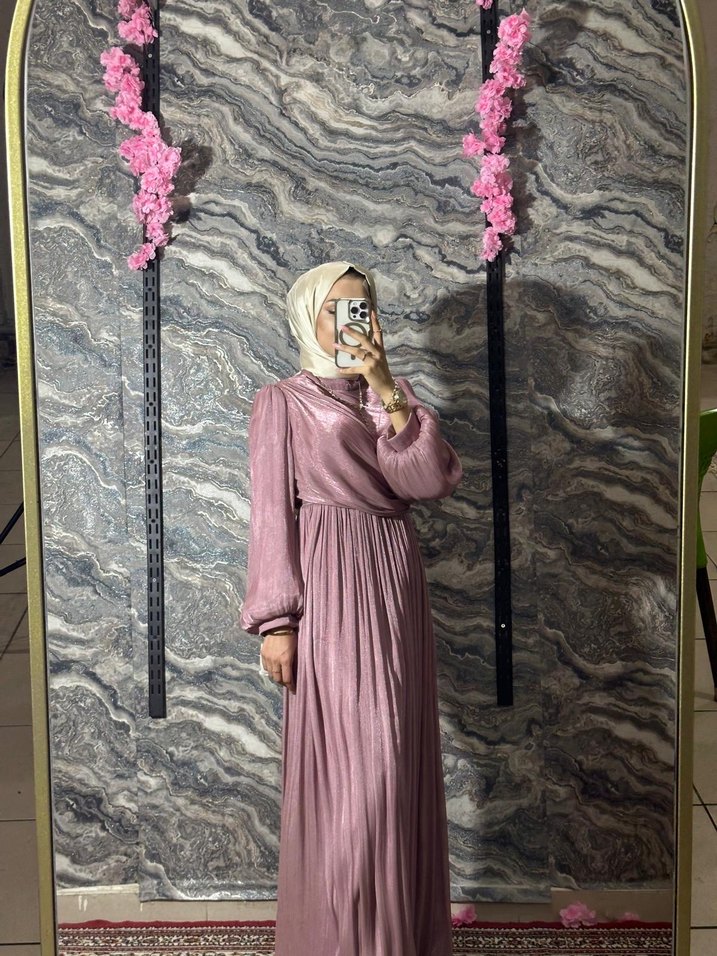 Pembe Salaş Uzun Elbise, Yüksek Yaka, Drapeli