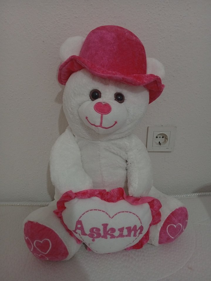Renkli pembe şapkalı, "Askim" yazılı kalp yastıklı yumuşak peluş ayı oyuncağı. yaklalık 55 sn. civarında dır.. hiç kullanılmadı olduğu gibi duruyor..