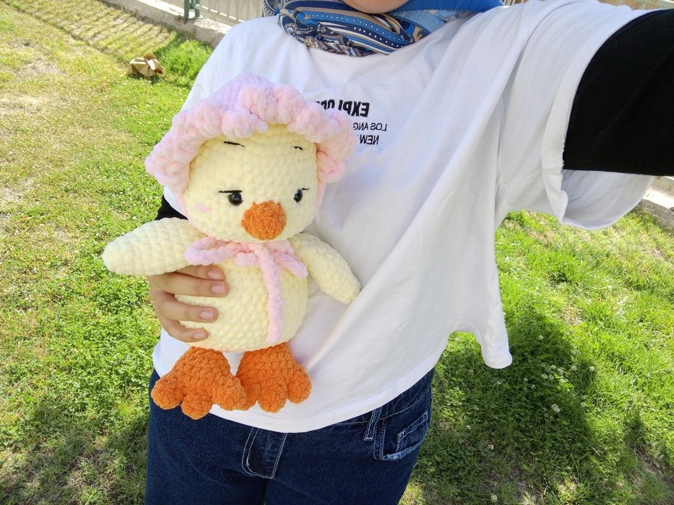 Pastel pembe ve krem renkli, dokulu şapka ve eşarp detaylı yumuşak peluş ördek oyuncak. Turuncu ayak ve gagasıyla sarılmaya uygun.