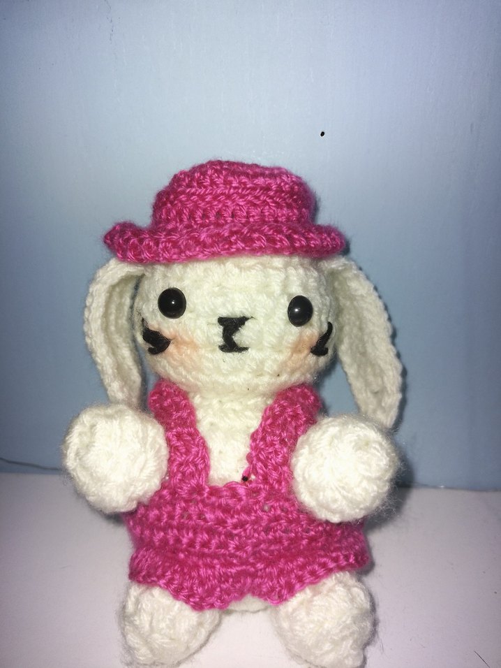 Pembe tığ işi elbise ve şapka giymiş, yumuşak dokulu renkli peluş tavşan oyuncak.