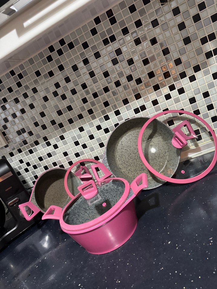 Pembe saplı ve kapaklı, gri taş görünümlü tabanlı tencere seti. Kapaklar şeffaf ve pembe kenarlıklı.