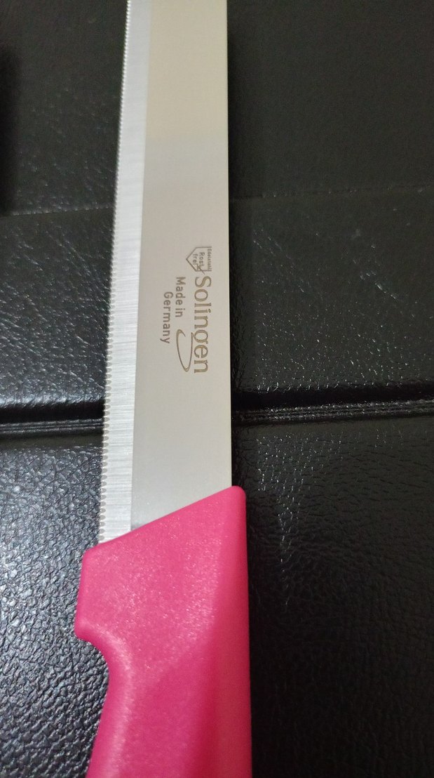 Parlak pembe saplı, dişli bıçağın üzerinde Solingen, Almanya damgası bulunur. Almanya'dan getirilmiş orijinal Solingen markadır. 22cm paslanmaz çelik gövdeye sahip olan ürün oldukça keskindir. Kaliteli ürünü bitmeden alın ve aldırın. Bir adet fiyatıdır. Çoklu alımlar için iletişime geçiniz