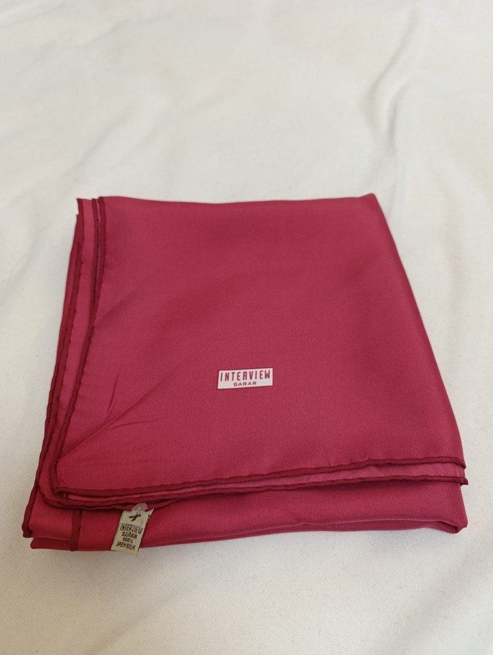 Pembe renkli, saten dokulu kadın eşarp parlak görünüme sahip, minimal ve zahmetsiz şıklık sunar. Üzerinde "INTERVIEN" etiketi vardır. Sarar markasına aittir tivil ipek tir. Renginden dolayı çok kullanamadım