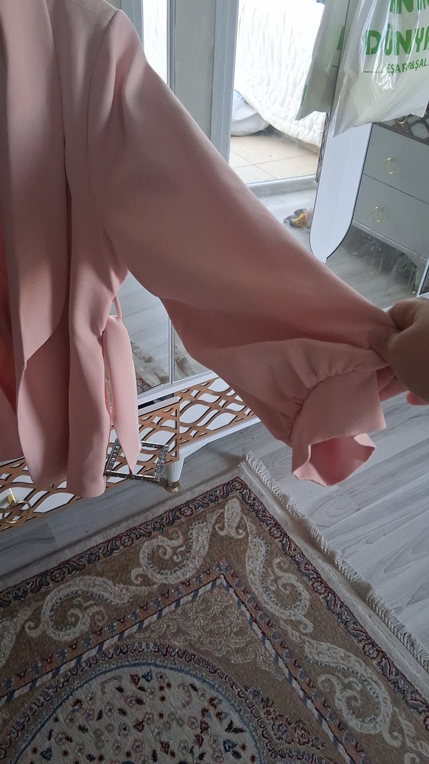 Pembe pastel renkte, saten kumaştan, V yakalı, balon kollu, bol kesim blazer ceket. Günlük kullanım için Paris tarzı ve modern tasarım.