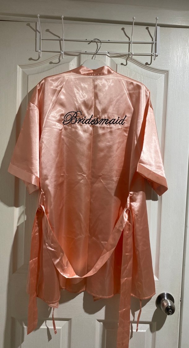 Parlak pembe saten kumaştan, kısa kollu ve bol kesim kadın sabahlık. Sırtında 'Bridesmaid' baskısı bulunur ve midi boydadır. Minimalist sokak stili ile uyumludur.