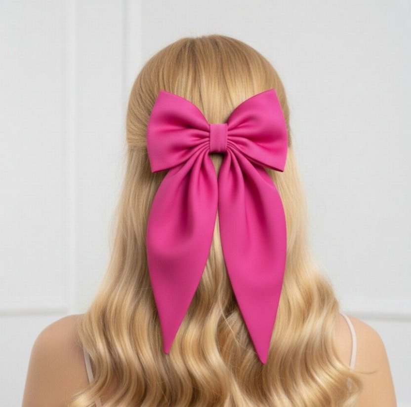 Cesur pembe saten büyük fiyonk saç aksesuarı, pop kültür tarzına uygun Paris esintili şıklık katıyor.