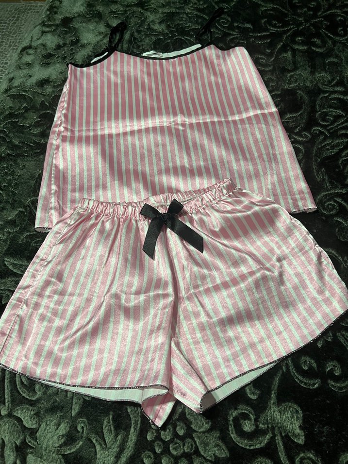 Kadınlar için pembe beyaz çizgili, bol kesim askılı üst ve siyah fiyonk detaylı şortlardan oluşan rahat mini pijama takımı.