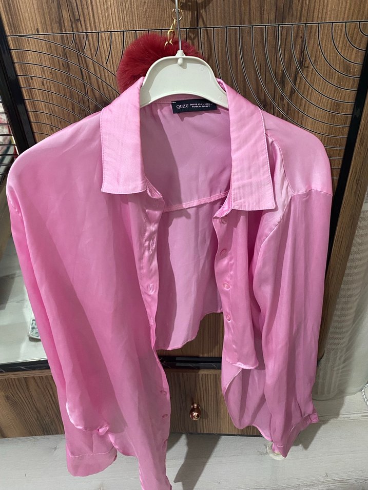 Pembe pastel renkte, saten dokulu, düğmeli ve uzun kollu kadın gömleği. Salaş kesimi ve yakalı tasarımıyla günlük kullanıma uygundur.