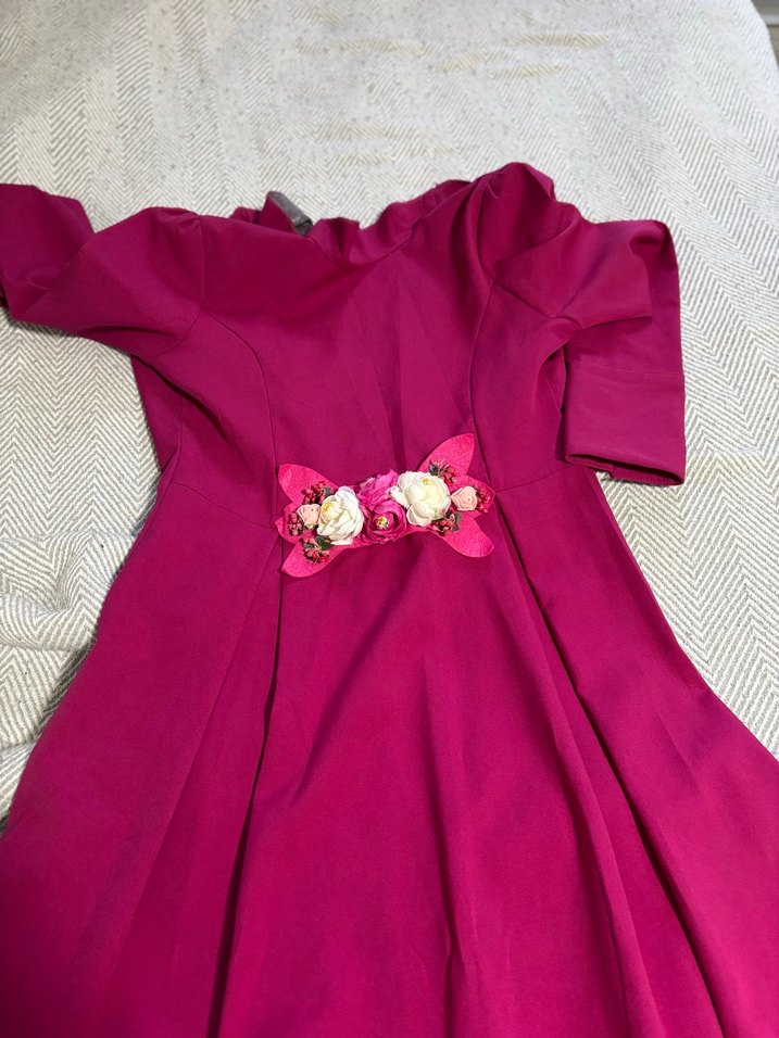 Düğmeli, tekne yaka ve uzun kesime sahip saten kumaştan yapılmış, çiçek detaylı parlak pembe abiye elbise.
