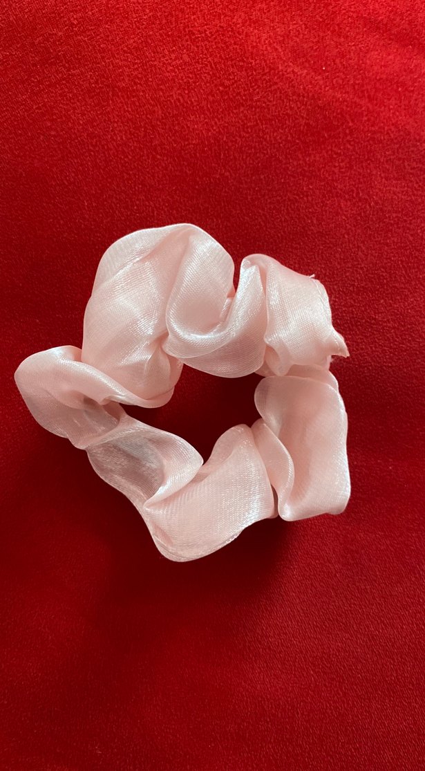 Pastel pembe renkli, saten dokulu ve fırfırlı tasarıma sahip minimalist ve sade saç tokası.