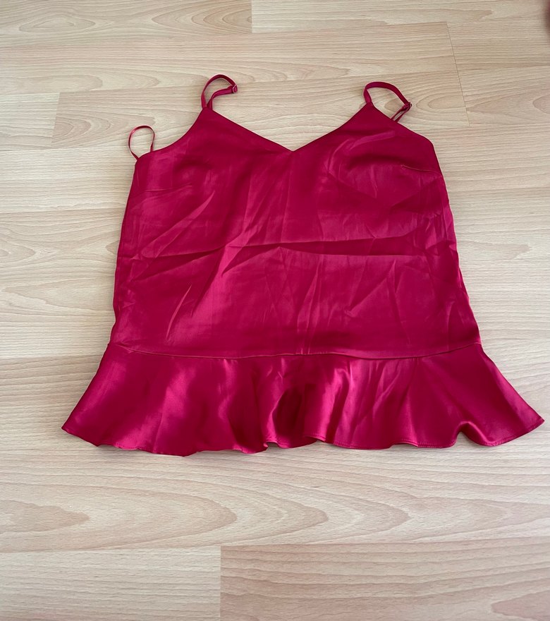 Pembe saten kumaştan, V yakalı ve fırfırlı mini atlet. Sade ve parlak dokusuyla romantik akşamlar için ideal, cesur ve minimalist tarzda.