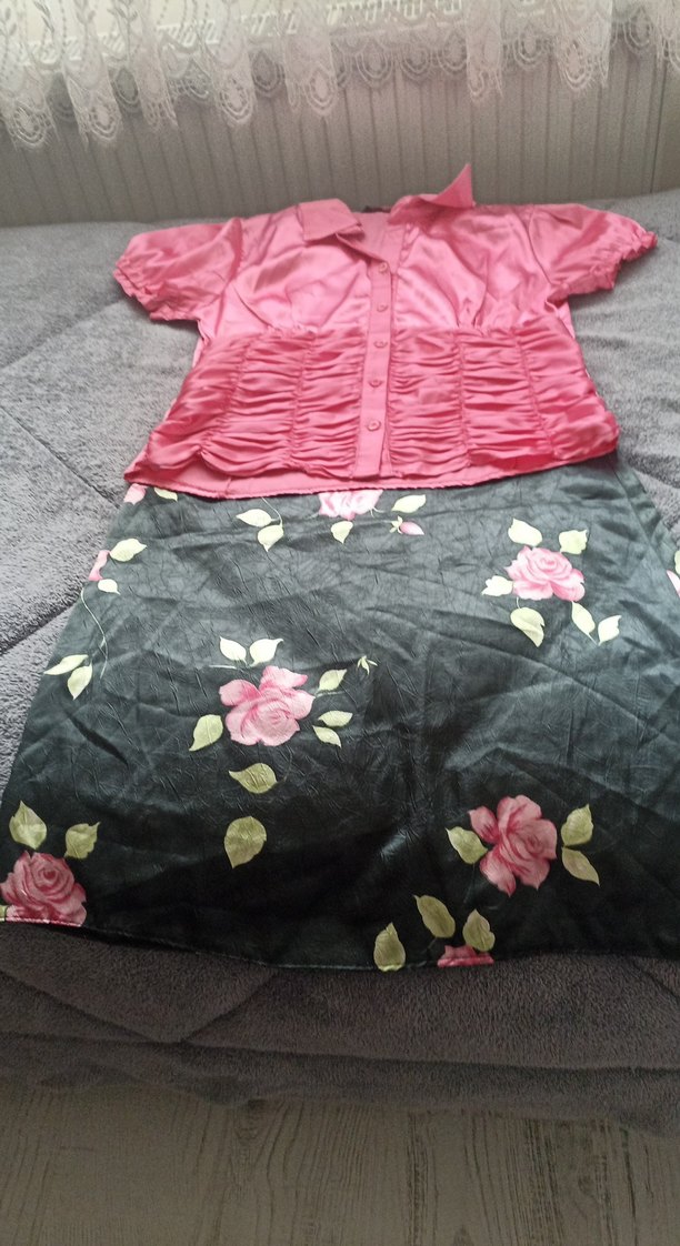 Pembe saten gömlek ve etek takim