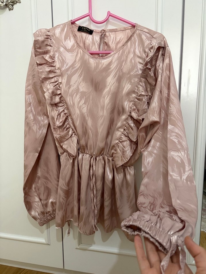 Uzun kollu, V yaka ve ön ile manşetlerde volan detaylı, saten görünümlü, parlak ve bağcıklı midi uzunlukta bol kesim bluz.