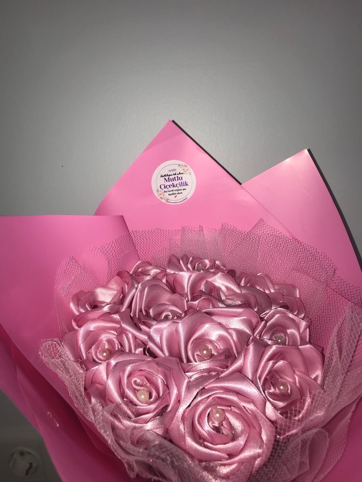 Pastel pembe renkte, saten güller ve ince tül detaylarıyla süslenmiş buket.