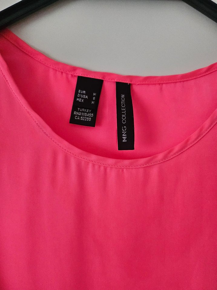 Pembe saten kumaştan, yuvarlak yakalı ve kolsuz, bol kesim hamile bluzu. Normal midi boyda, baskılı ve normcore tarzında, günlük kullanım için pratik ve şık.