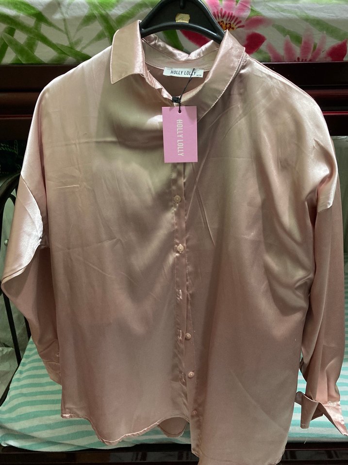 Bej saten kadın gömlek, uzun kollu ve düğmeli ön cepheli. Gevşek kesim ve normal midi boyda, günlük kullanıma uygun. "HOLLYLOLY" markalıdır.