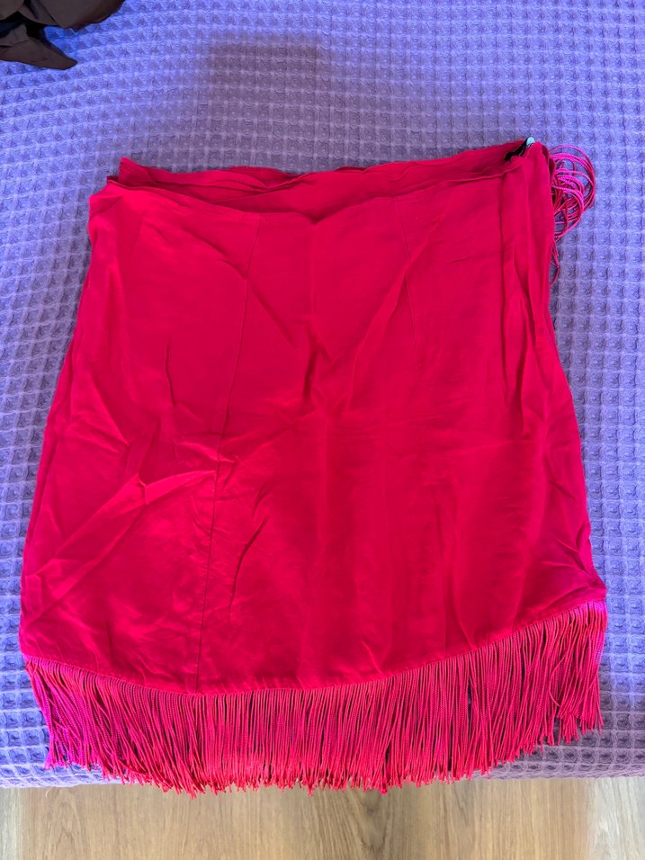 Pembe saten kumaştan yapılmış, püsküllü kenarlı pareo.