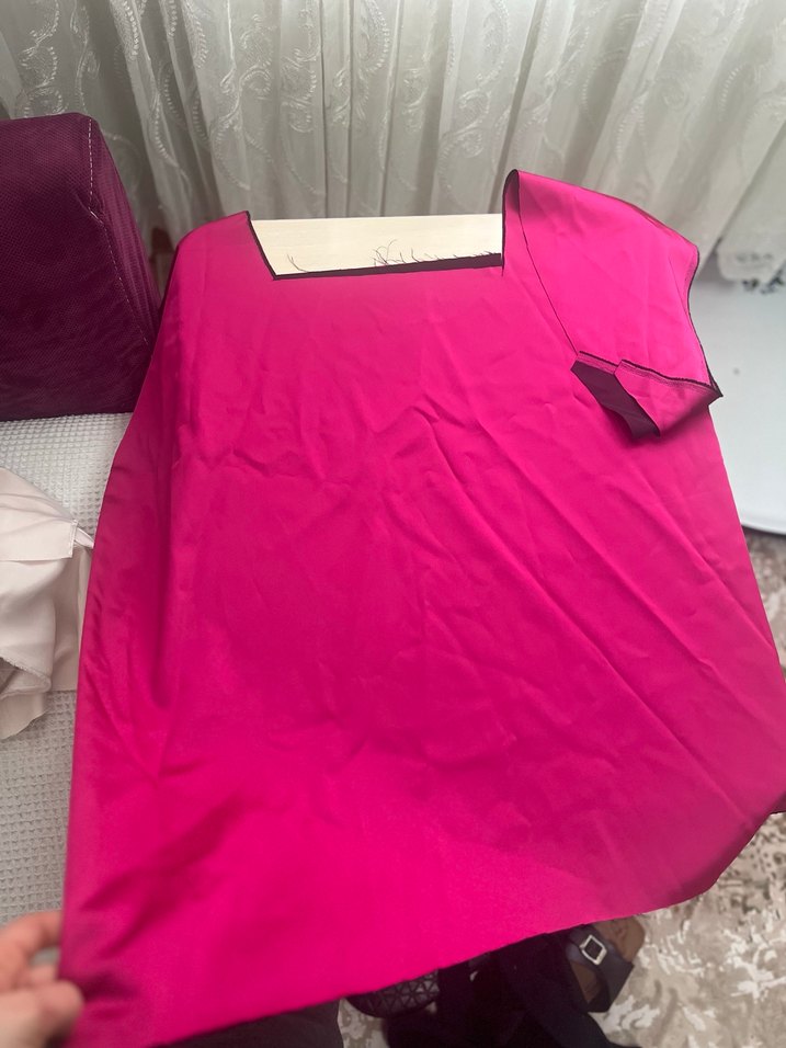 Parlak pembe saten kumaştan, kayık yakalı ve kısa kollu bol kesim hamile bluzu. Rahat günlük kullanım için drapeli tasarım.