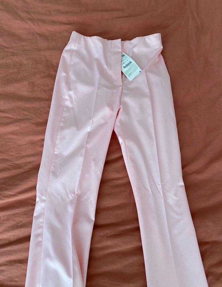 Pembe saten kumaştan, uzun ve regular fit kadın pantolon. Desensiz, normcore tarzıyla iş ve günlük kullanıma uygundur. ✨