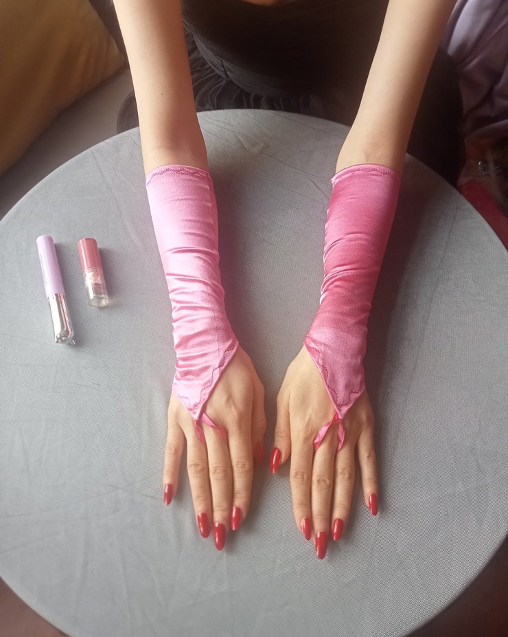 İpek gibi dokuda, pembe renkli, kadın eldivenleri. Avant-garde ve gotik tarzları renkli ve şık bir şekilde birleştirir.