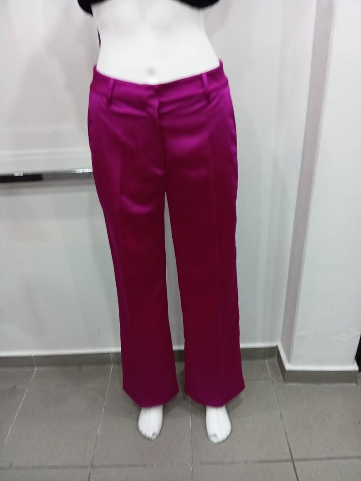 Pembe, parlak saten kumaştan, midi boy, regular fit kadın kumaş pantolon. Ofis ve sokak stiline uyumlu, zahmetsiz şıklık sunar. ✨