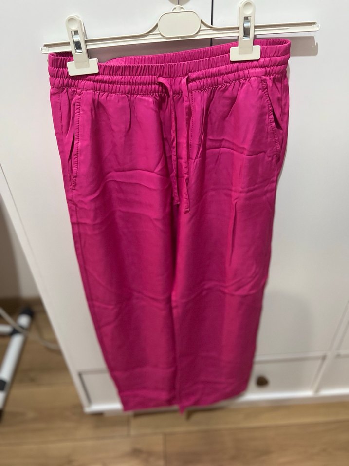 Parlak pembe renkte, saten kumaştan yapılmış, midi boy ve salaş kesim kadın pantolonu. Lastikli ve bağcıklı beli ile yan cepleri bulunur, günlük sokak stiline uygundur.