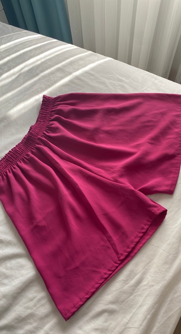 Pembe, saten kumaştan yapılmış, salaş kesim ve drapeli mini şort Rahat ve şık, romantik akşamlar için uygun.