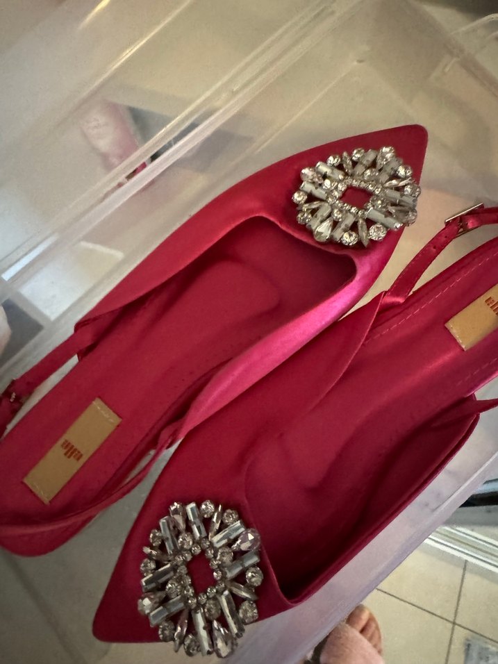 Parlak pembe saten malzemeden, tokalı ve dolgu topuklu zarif abiye ayakkabılar, düğünler için uygundur. Elle ayakkabı sıfır