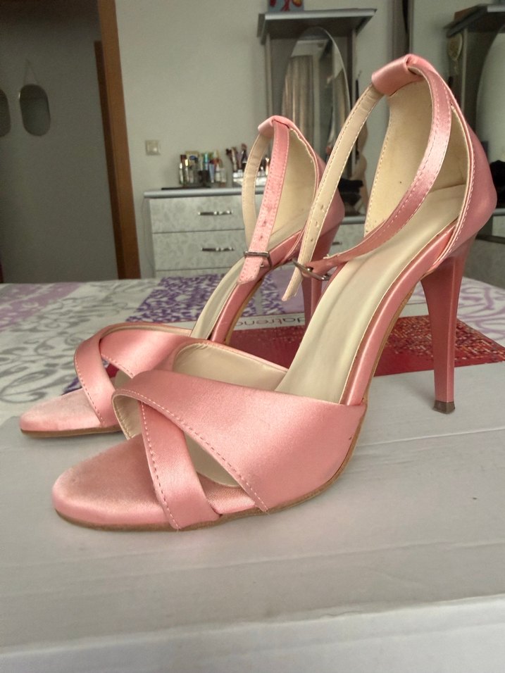 Saten pembe ince topuklu ayakkabılar, tokalı bant ve desensiz şık tasarımıyla düğün ve özel günlere uygundur.