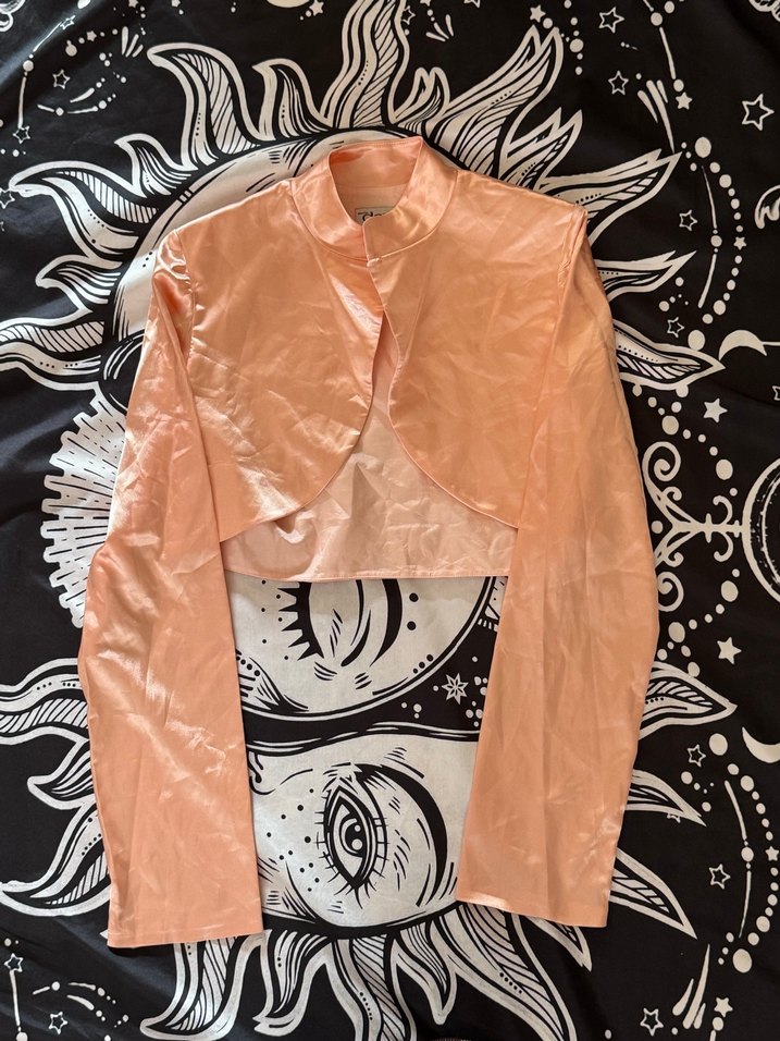 Pembe saten kumaştan, düğmeli ön kısmı ve straplez yakasıyla uzun kollu, vücuda oturan bolero. Pastel renk ve sokak modası tarzında şık bir parça.