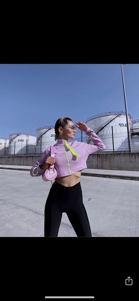 Pembe, uzun kollu, yüksek yakalı ve pastel tie-dye desenli, kısa kesim crop sweatshirt. Rahat ve şık, sadece fermuar uzantısı çıkarıldı