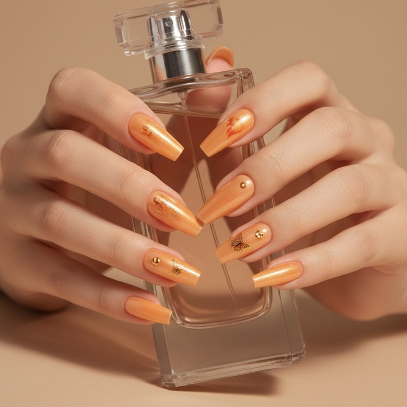 pembe renkli, canlı tırnak süslemeleri; kelebek ve soyut desenler gibi küçük detaylar içerir. Tırnaklara renkli bir dokunuş katar. cicekli