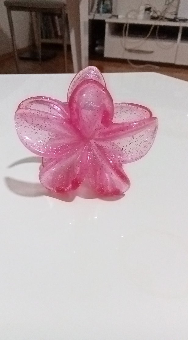 Pembe şeffaf plastikten yapılmış, renkli sim detaylı çiçek şeklinde saç tokası.