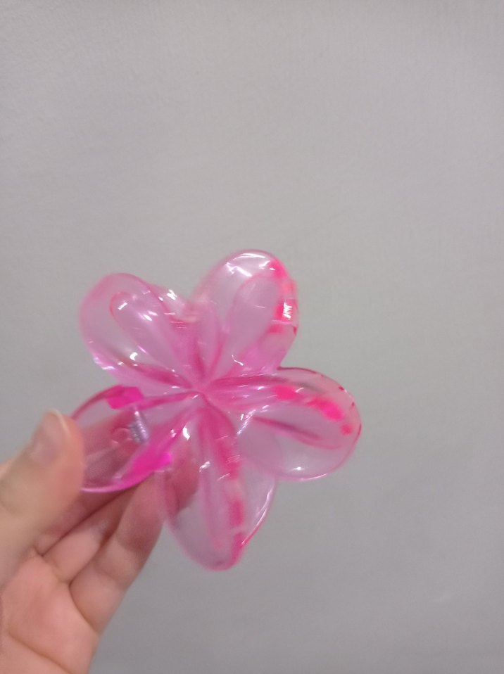 Pembe renkte, şeffaf plastikten yapılmış çiçek şeklinde saç tokası, renkli ve minimalist bir tarz sunar.