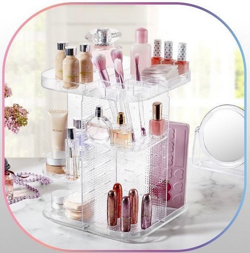 Pembe şeffaf makyaj düzenleyici, fırçalar, şişeler ve kozmetik ürünler için çoklu bölmeler içerir. Güzellik eşyalarınızı düzenli ve erişilebilir tutar.