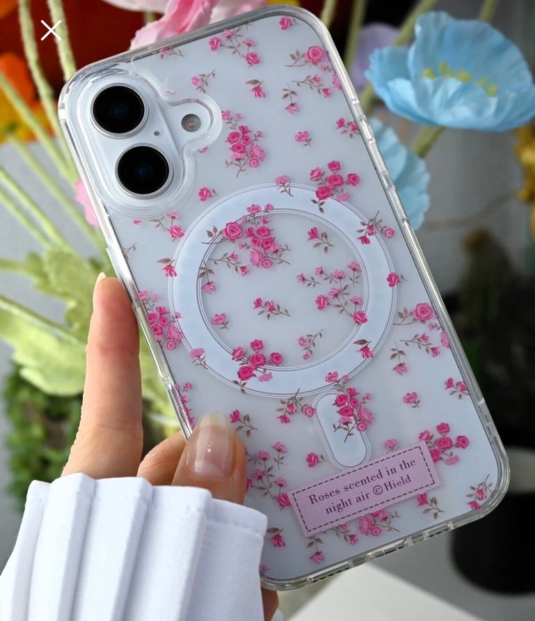 Şeffaf telefon kılıfı, pastel pembe çiçek desenli, küçük güller ve magsafe çalısıyor. Çok az sayılı kullanıldı.
