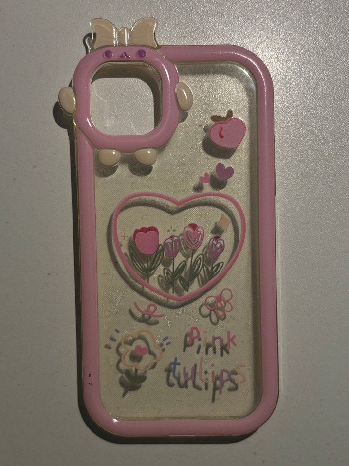 Pastel pembe renkte, tokalı ve lale desenli telefon kılıfı, üzerinde "Pink tulips" yazısı bulunur. Az kullanıldı hafif sarı