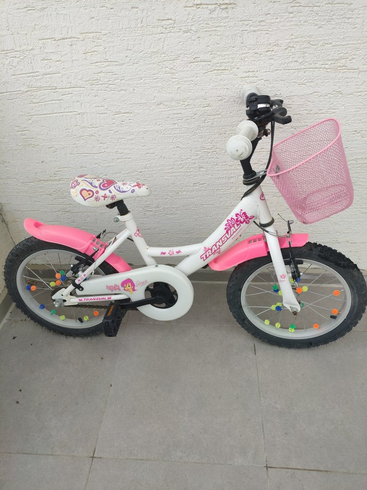 Pembe renkli çocuk bisikleti, renkli jant süslemeleri ve ön sepet ile donatılmıştır. Kalp desenli konforlu sele ve sağlam lastiklere sahiptir.