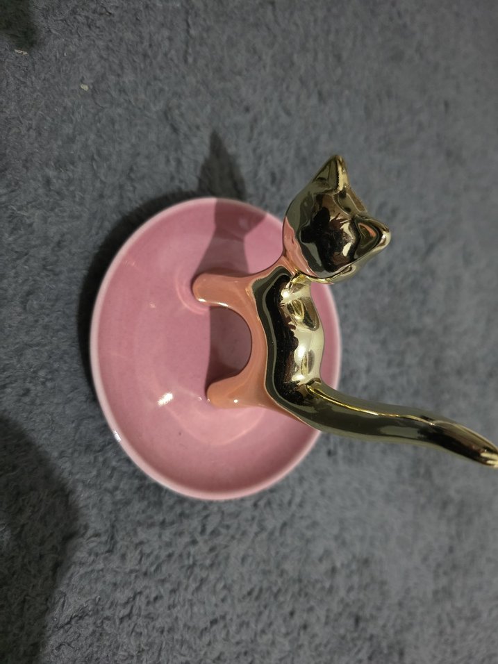 Pastel pembe seramik taban ve parlak altın renkli kedi figürlü takı standı, yüzük ve küçük aksesuarlar için uygun.