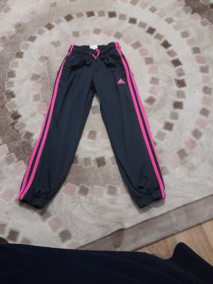 Siyah kumaş üzerinde koyu pembe şeritlere sahip, bol kesim çocuk eşofman altı. Yumuşak ve sıcak tutan kumaştan, lastikli bel ve bileklerle spor ve günlük kullanım için uygundur. ♀️